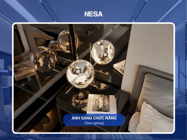 Ví dụ phổ biến là đèn bàn làm việc, đèn đọc sách đầu giường, đèn chiếu sáng khu vực bếp hoặc bàn ăn. Khi thiết kế, ánh sáng chức năng cần được bố trí hợp lý để vừa tiện dụng, vừa không phá vỡ tổng thể không gian.