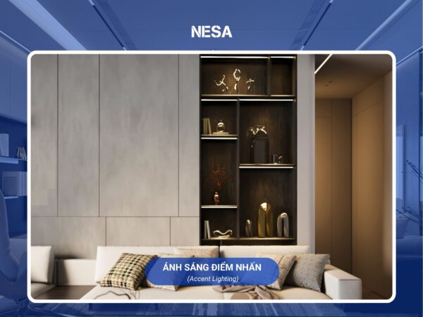 Ánh sáng điểm nhấn thường được sử dụng cho tranh treo tường, kệ trang trí, hốc tường, tủ trưng bày… Thông qua cách chiếu sáng có chủ đích, những chi tiết nhỏ cũng có thể trở thành điểm nhấn ấn tượng trong thiết kế nội thất.